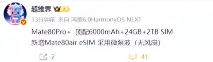 另外,数码博主“超维界”更爆料称,华为Mate 80 Pro+顶配6000mAh电池,配备14GB+2TB存储组合,用的仍旧是SIM卡,同时,该系列新机还将新增Mate 80 air版,该款新机将有可能采用eSIM通信模式,并采用微泵液散热,不过并不会配备传说中的内置风扇散热。