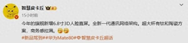 另外,此前,“智慧皮卡丘”还曾爆料,“今年的旗舰新增6.8寸3D人脸直屏。全新一代通讯网络架构。超大杯有钛和陶瓷方案,商务感拉满。”从爆料来看,Mate 80系列最直观的变化是全系告别等深微曲屏,转向直屏设计。预计将强化信号稳定性与数据传输效率,延续其在通信技术领域的传统优势。